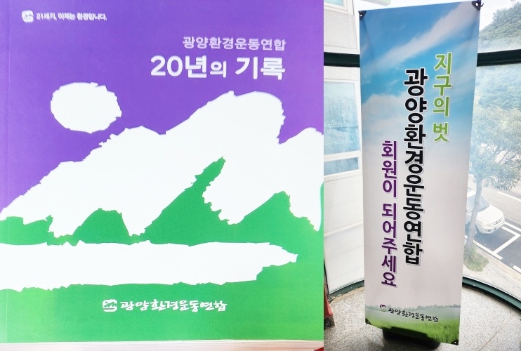 지난 2019년 2월 발행된 광양환경운동연합 '20년의 기록'과 "'지구의 벗' 광양환경운동연합 회원이 되어 주세요" 입구에 안내 현수막 (사진=최창윤 기자)