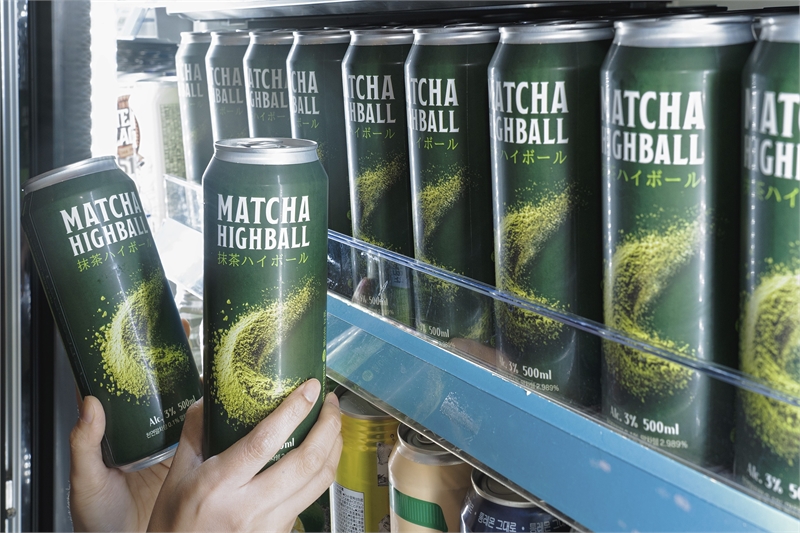 상품 패키지로도 말차하이볼을 한눈에 확인할 수 있다. 말차를 상징하는 밝고 생생한 녹색캔에 말차 가루를 전면에 배치했다. 여기에 풀오픈탭 형식으로 캔 뚜껑 전체가 열려 음용하기 쉽게 했다.
