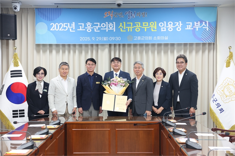 [한국정경신문(고흥)=최창윤 기자] 고흥군의회(의장 류제동)는 소회의실에서 9월 29일 자 인사발령에 따른 신규 공무원 임용장 교부식을 가졌다고 30일 밝혔다,