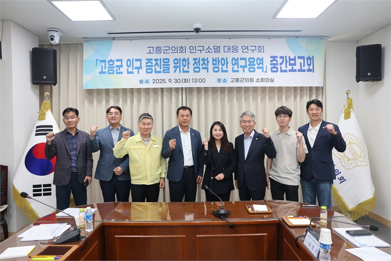 [한국정경신문(고흥)=최창윤 기자] 고흥군의회(의장 류제동) 의원연구단체인 ‘고흥군의회 인구소멸 대응 연구회(대표 박경석)’는 지난달 30일 군의회 소회의실에서 ‘고흥군 인구 증진을 위한 정착 방안 연구용역’ 중간보고회를 개최했다고 1일 밝혔다.