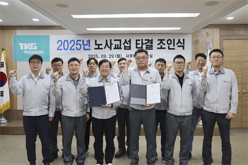 TKG휴켐스 노사는 “오늘 이 뜻 깊은 타결의 자리가 미래를 향해 힘차게 나아가는 새로운 출발점이 되기를 기대하며 앞으로도 TKG휴켐스가 더 크게 도약할 수 있도록 상생의 노사문화를 이어 나가는데 함께 하자”고 다짐했다.