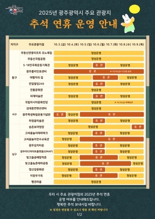 이승규 신활력추진본부장은 “광주에는 북적이는 관광지가 아니더라도 조용하고 매력적인 숨은 명소가 많다”며 “추석 연휴 시민과 관광객들이 광주의 가을 정취 속에서 여유롭고 풍성한 명절을 보내시길 바란다”고 말했다.
