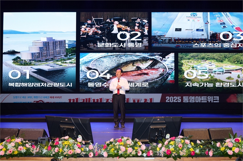 통영시는 지난 3일 통영시민문화회관 대극장에서 지방자치 30주년 미래비전 선포식을 성황리에 개최했다고 10일 밝혔다. 천영기 시장의 ‘통영 5대 미래비전’ 브리핑에서는 해양레저관광·문화·스포츠·수산·환경 등 통영의 핵심 가치를 아우르는 발전 전략과 시민이 주인인 도시를 향한 미래 100년의 청사진을 제시함으로써 시민들의 깊은 공감과 기대를 이끌어냈다. (자료=통영시)