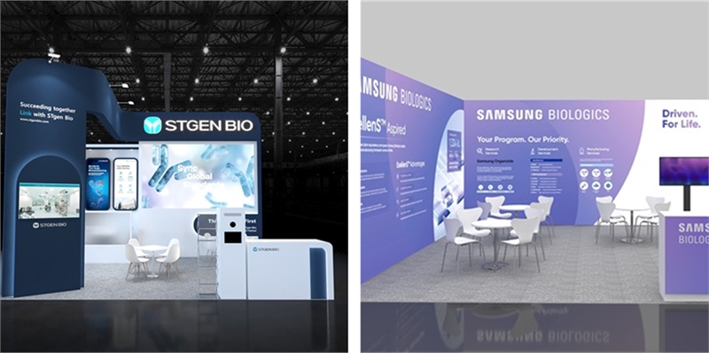 (왼쪽부터)에스티젠바이오, 삼성바이오로직스 부스 모습(사진=각 사)