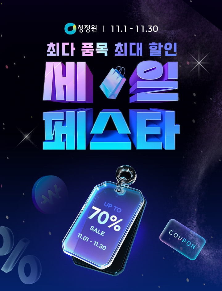 대상 공식 온라인 쇼핑몰 정원e샵이 11월 한 달간 연중 최대 규모의 할인 행사 청정원 세일 페스타를 연다고 10일 밝혔다. 인기 제품을 총망라해 최대 70% 할인 혜택을 제공한다.