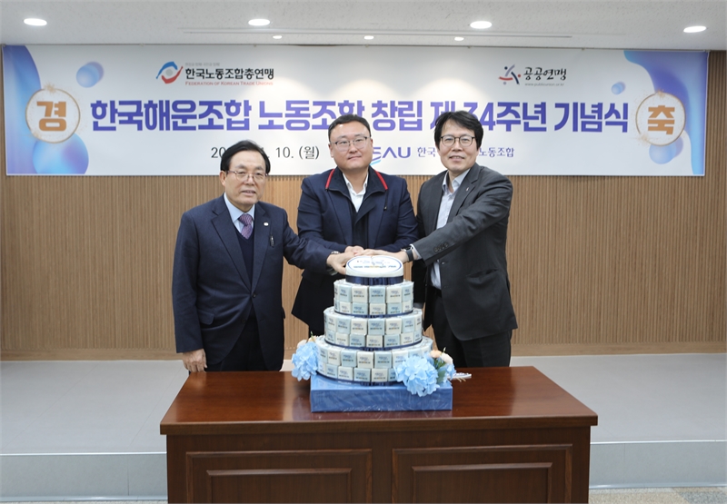 이채익 한국해운조합 이사장(왼쪽)과 박세현 노조위원장(가운데), 정정희 공공연맹 위원장이 노조창립 제34주년 기념식에서 케이크 커팅을 하고 있다. (사진=전국해양수산노동조합연합)