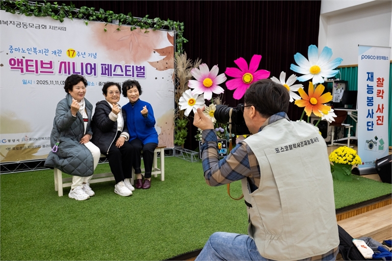 광양제철소 재능봉사단이 지난 11일 광양시 중마노인복지관에서 열린 ‘액티브 시니어 페스티벌’에 참여하며 지역 어르신들에게 기쁨과 축제의 시간을 선사했다. 사진촬영 (자료=광양제철소)