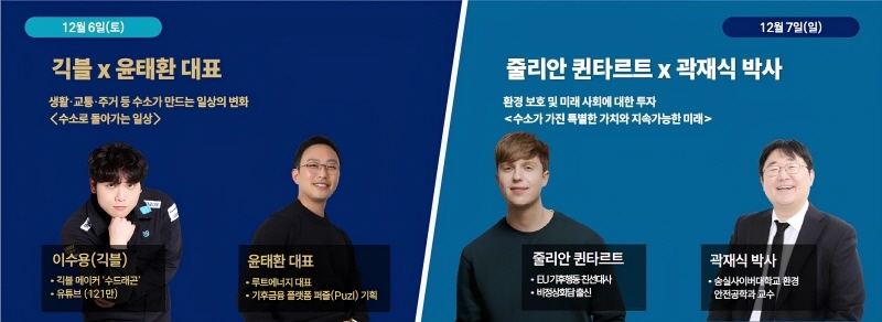 7일에는 벨기에 출신 방송인이자 EU 기후행동 친선대사 줄리안 퀸타르트와 숭실사이버대학교 환경안전공학과 곽재식 박사가 수소의 가치와 지속가능한 미래에 대해 다양한 관점의 의견을 나눌 예정이다.