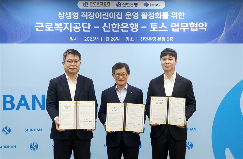 신한은행은 26일 서울 중구 신한은행 본점에서 근로복지공단, 토스와 ‘상생형 공동직장 어린이집’ 협력 운영 업무협약을 체결했다.