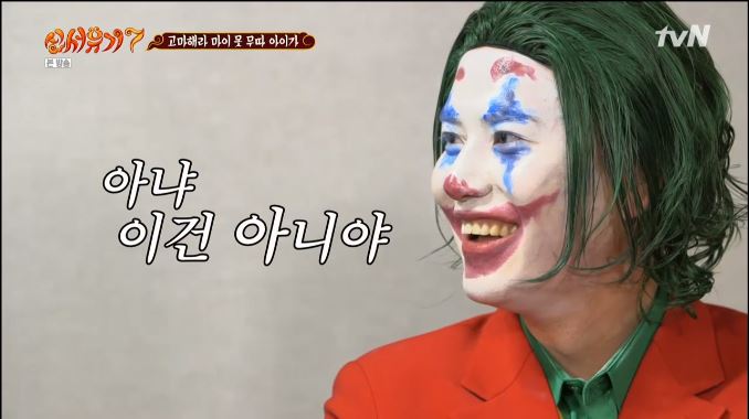 자신이 유행어를 몰랐다는 생각에 조규현은 너털 웃음을 지었다. 하지만 조커 분장 때문인지 해맑게 미소를 짓는 듯한 착시현상이 일어났다. 이에 발끈한 이수근은 “너 너무 해맑게 웃는 거 아냐”라고 소리쳤다.