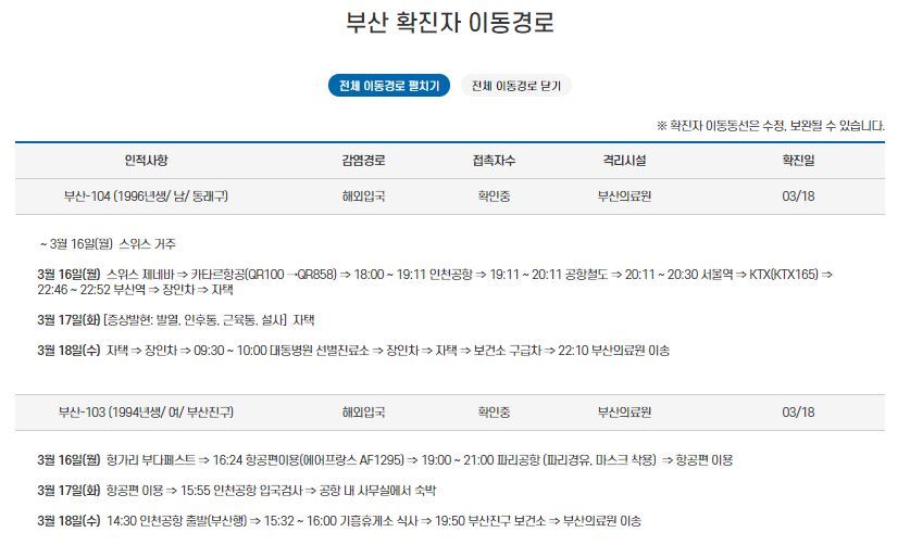 공개된 동선은 다음과 같다. 지난 16일 헝가리 부다페스트에서 오후 4시 25분 에어프랑스 AF1295를 타고 오후 7시 파리 공항에 도착했다. 이후 17일 오후 9시 출발해 인천공항에 도착했다. 17일에는 공항 내 사무실에서 숙박했다. 18일 인천공항에서 부산으로 출발했고 오후 3시 30분 경 기흥휴게소를 들렸다. 오후 7시 50분 부산진구 보건소를 들려 부산의료원으로 이송됐다.
