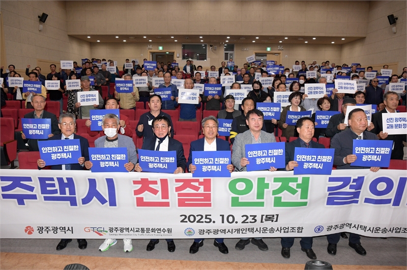[한국정경신문(광주)=최창윤 기자] 광주광역시(시장 강기정)는 23일 광주교통문화연수원에서 ‘택시운수종사자 친절·안전 결의대회’를 열고 신뢰받는 택시 서비스 구현을 위한 실천 의지를 다졌다.이번 결의대회는 최근 택시요금 인상에 따른 시민 공감대 확산과 함께 택시업계의 서비스 품질 제고를 통해 시민이 안심하고 이용할 수 있
