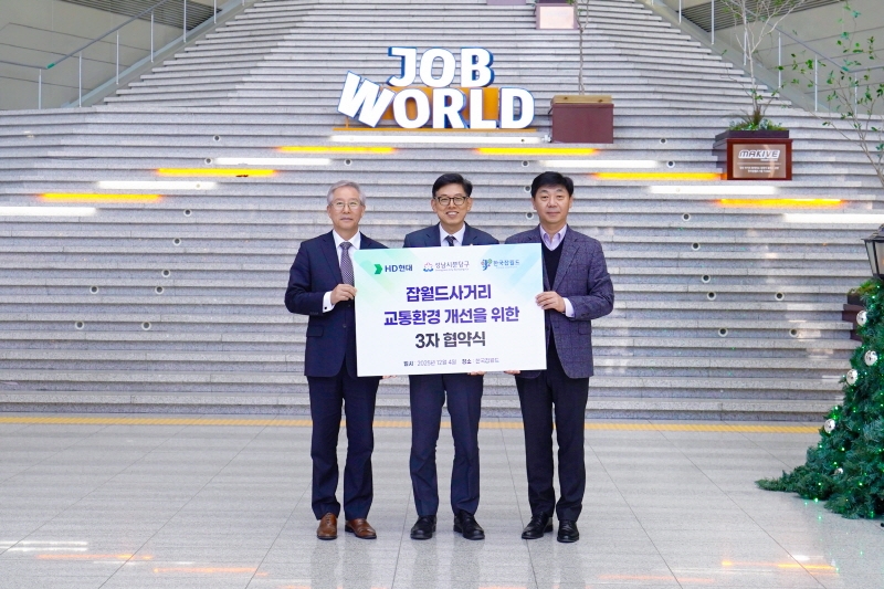 [한국정경신문=임윤희 기자] 공공기관과 기업, 지방자치단체가 한데 손잡고 ‘잡월드사거리’ 교통난을 풀기 위한 상생형 교통환경 개선 모델을 가동했다.한국잡월드(이사장 이병균)는 4일 성남시 분당구청 및 HD현대와 ‘교통환경 개선을 위한 업무협약’을 체결했다. 이날 행사에는 이병균 한국잡월드 이사장을 비롯해 김광병 분당구청장