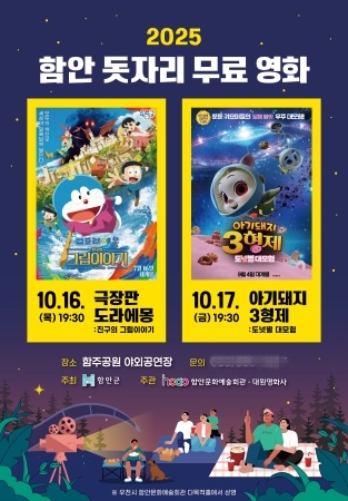 [한국정경신문(함안)=박순희 기자] 함안문화예술회관은 군민에게 영상문화를 즐길 기회를 제공하기 위해 오는 16일과 17일 함주공원 야외공연장에서 ‘함안 돗자리 무료영화’를 운영한다고 10일 밝혔다.첫날 상영작 ‘극장판 도라에몽: 진구의 그림이야기’(10월 16일)는 도라에몽과 진구가 비밀도구를 이용해 그림 속 세계로 떠나