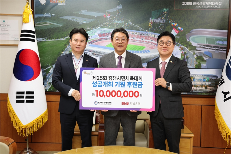 [한국정경신문(김해)=박순희 기자] 김해시는 BNK경남은행에서 제25회 김해시민체육대회 성공 개최를 기원하며 후원금 1,000만원을 김해시체육회에 기탁했다고 10일 밝혔다.BNK경남은행 허종구 부행장은 “김해시민체육대회는 주민 화합을 위한 대회”라며 “후원금이 원활한 대회 준비와 운영에 보탬이 되길 바란다”고 밝혔다. 서