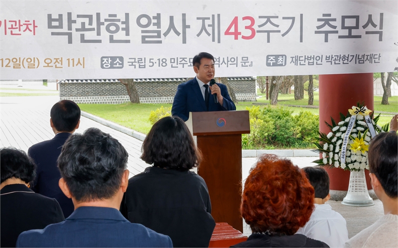 [한국정경신문(광주)=최창윤 기자] 이정선 광주시교육감이 12일 국립5·18민주묘지 ‘역사의 문’ 앞에서 열린 ‘민주화의 새벽기관차 박관현 열사 제43주기 추모식’에 참석했다.이날 추모식에는 이정선 교육감을 비롯해, 강기정 광주광역시장, 윤목현 5·18기념재단 이사장, 이개호 영광군 국회의원, 유족 및 시민사회단체 관계자