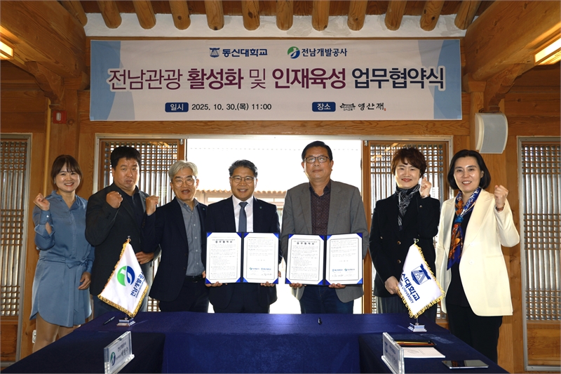[한국정경신문(무안)=최창윤 기자] 전남개발공사(사장 장충모)는 지난달 30일 한옥호텔 영산재에서 동신대학교와 한옥호텔 오동재·영산재 활성화 및 관광 전문 인재 양성을 위한 업무협약을 체결했다고 밝혔다.이번 협약은 ▲호텔 현장실습 지원 및 학점 반영 ▲관광콘텐츠 공동개발 ▲홍보·마케팅 협업 ▲세미나 및 포럼 개최 등 전남