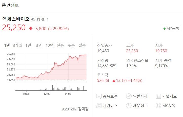 엑세스바이오가 전날(7일) 상승세로 장을 마치면서 투자자들의 관심이 계속되고 있는 것. 엑세스바이오는 전 거래일 대비 29.82%(5800원) 오른 2만 5250원에 거래를 마쳤다.