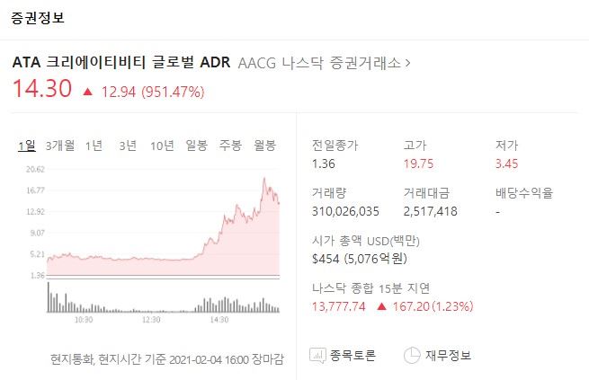4일(현지시간) 나스닥 증권거래소에서 aacg 주가는 14.30 포인트에 장을 마쳤다. 이는 전 거래일 대비 951.47%(12.94포인트) 오른 값이다.