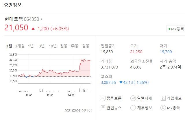 지난 4일 한국거래소에 따르면 현대로템 주가는 장 마감을 앞두고 급등했다.