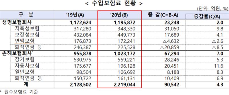 2020년 보험업계 수입보험료 현황 [자료=금융감독원]