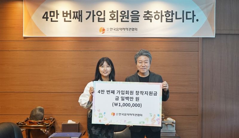 [한국정경신문=이슬기 기자] 사단법인 한국음악저작권협회(회장 홍진영)가 지난 19일 4만 번째 회원 가입 기념식을 실시했다고 밝혔다.
