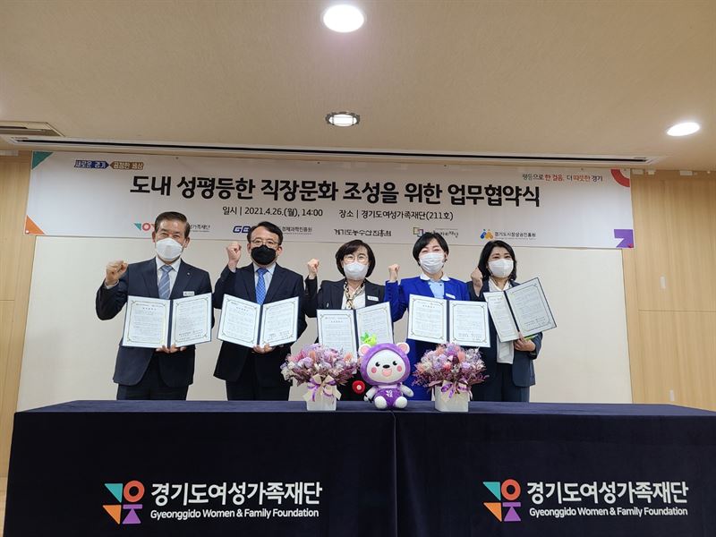 지난 26일 경기도여성가족재단 회의실에서 경기도경제과학진흥원, 경기도일자리재단 , 경기도시장상권진흥원, 경기도농수산진흥원은 ‘경기도 성평등한 직장문화 만들기 사업’ 업무협약서에 서명했다.