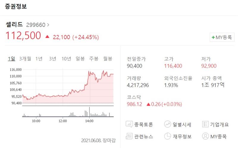 8일 한국거래소에 따르면 셀리드 주가는 11만 2500원에 거래를 마쳤다. 이는 전 거래일 대비 24.45%(2만 2100원) 오른 값이다.