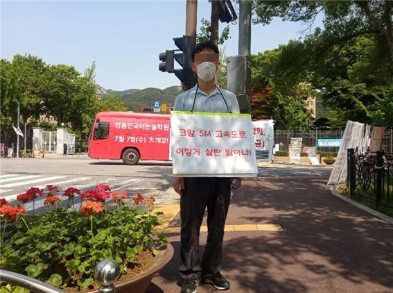 '이천-오산간 고속도로' 를 건설하면서 집과 단 5.5m 거리를 두고 건설되는 고속도로로 인해 주거권과 환경권에 심각한 침해를 입었다고 주장하는 제보자 A씨. A씨는 주무기관인 과천 서울지방국토관리청에서 시위를 이어가고 있다. [자료=제보자 제공]