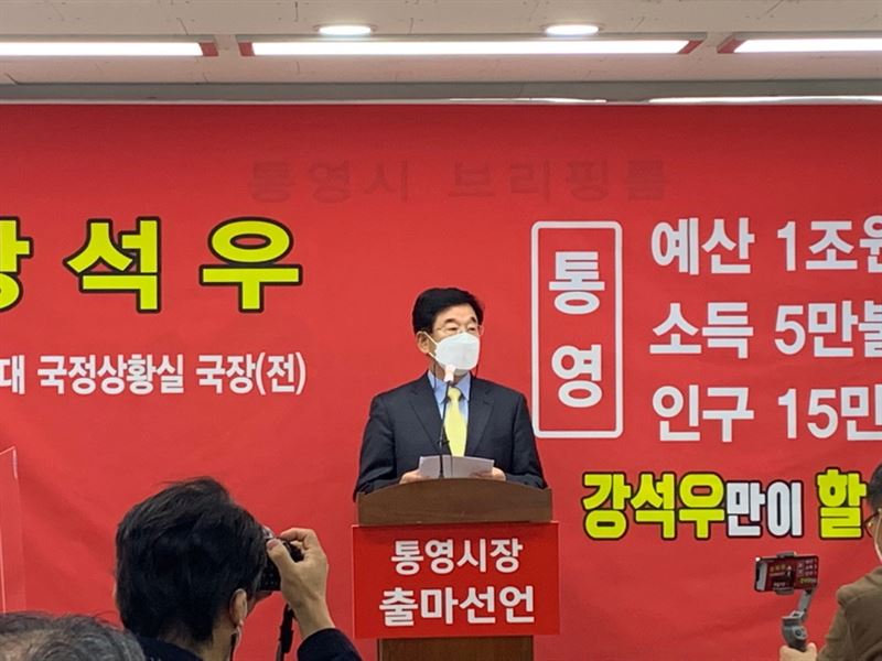 강석우 전 청와대 국정상황실 국장은 "지난 3년간 제 자신을 되돌아 보면서 절차탁마(切磋琢磨)의 시간을 보냈다"면서 "33여년 간 청와대, 국회, 총리실 등 중앙부처, 공공기관, 기업 등에서 배우고 닦은 저의 모든 역량과 열정을 마지막으로 사랑하는 내 고향땅 통영에 쏟고자 다시 여러분 앞에 섰다"고 말했다.