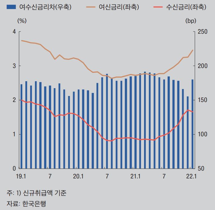 한은은 “향후 은행 여수신금리는 기준금리 추가인상 기대, 지표금리 상승의 영향이 반영되면서 완만한 상승세가 이어질 것으로 예상된다”며. “주요국 중앙은행의 통화정책 정상화 가속 움직임, 우크라이나 사태에 따른 지정학적 리스크 증대 등으로 은행의 대출태도가 강화될 경우 과거 사례와 유사하게 취약 기업을 중심으로 자금조달 비용이 높아질 가능성이 있다”고 내다봤다.