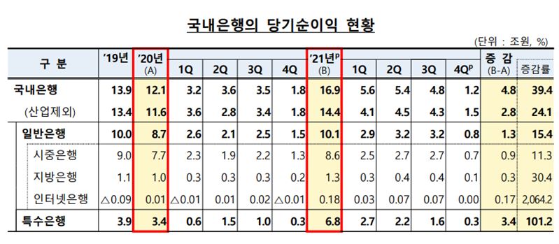 16일 금융권에 따르면 금융감독원은 ‘국내은행 영업실적(잠정)’에서 지난해 국내은행의 당기순이익이 16조9000억원으로 전년대비 4조8000억원 증가했다고 밝혔다.