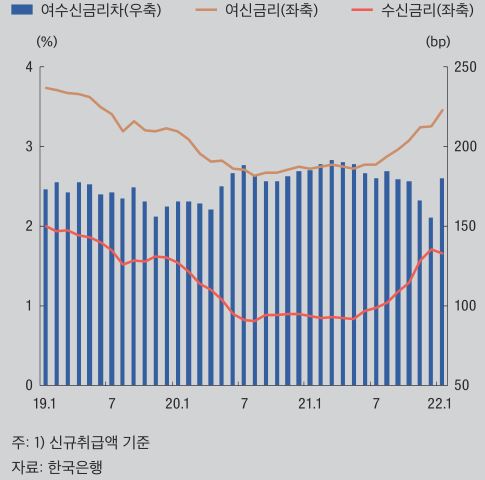 예금금리가 대출금리보다 더 큰 폭 상승하면서 예대금리차는 지난해 5월 1.89%포인트에서 올해 1월 1.80%포인트로 축소됐다.