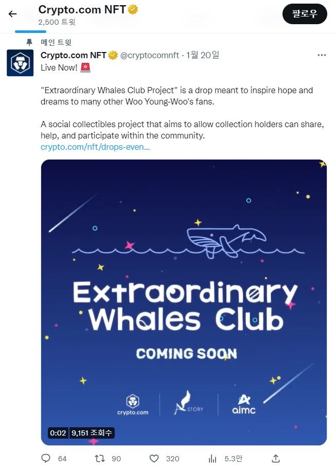 한편 크립토닷컴은 K-POP 음악 콘텐츠 NFT 플랫폼인 메타비트와 손잡고 '마마무 NFT' 스페셜 컬렉션을 출시한 데 이어 글로벌 종합 콘텐츠 스튜디오 에이스토리 및 에이스토리의 IP 비즈니스 자회사 AIMC와 '이상한 고래 클럽(Extraordinary Whales Club)' 커뮤니티 프로젝트를 출시한다.