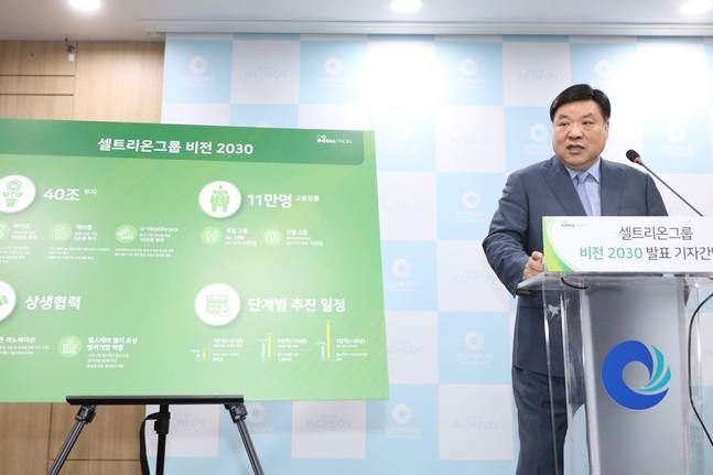 지난 2019년 5월16일 인천시청에서 서정진 셀트리온 명예회장(당시 회장)이 기자간담회를 열고 ‘비전 2030’을 발표하고 있다. [자료=셀트리온]