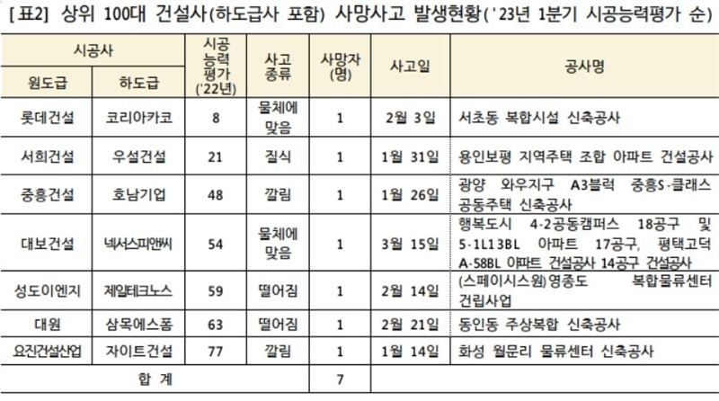 올해 발생한 사망자 중 100대 건설사 현장에서 발생한 사망자는 7명이며 각각 다른 7개사(롯데건설·서희건설·중흥건설·대보건설·성도이엔지·대원·요진건설산업)에서 발생했다.