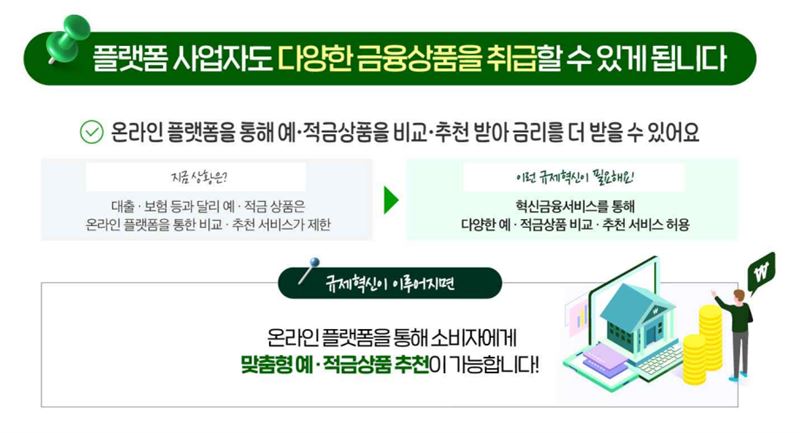 온라인 예금상품 비교·추천 서비스란 금융 소비자가 예적금 중개 플랫폼을 통해 예적금 상품을 한눈에 비교하고 자신에게 적합한 상품을 추천받고 가입할 수 있는 서비스다. 기존에는 플랫폼을 통해 금리만 비교해 볼 수 있었고 상품에 가입하려면 해당 금융회사 앱이나 홈페이지로 이동해야 하는 번거로움이 있었다.