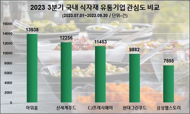 25일 여론조사기관 데이터앤리서치는 SNS 등 12개 채널 23만 개 사이트를 대상으로 지난 7월부터 9월까지 국내 대표 식자재 유통기업 5곳의 관심도를 빅데이터 분석해 이 같이 밝혔다.