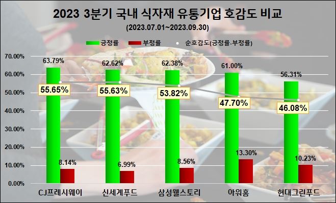 분석 결과 CJ프레시웨이가 올 3분기 긍정률 63.79%, 부정률 8.14%, 긍정률에서 부정률을 제외한 값인 순호감도가 55.65%를 기록하면서 소비자 호감도 1위에 올랐다.