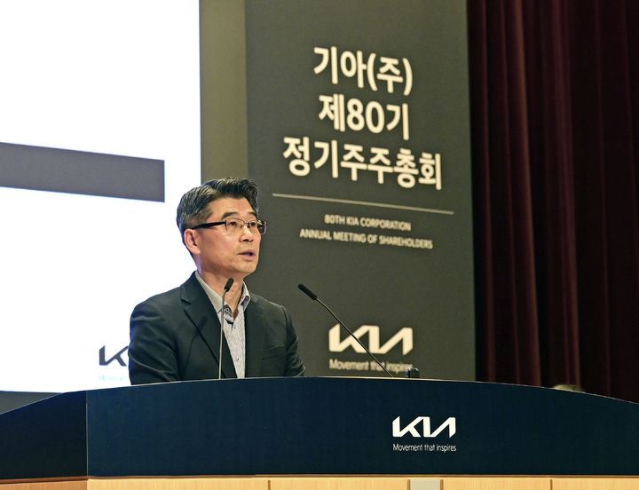 송호성 기아 사장이 지난 3월 서울 서초구 앙재동 기아 본사에서 열린 기아의 제80기 정기 주주총회에서 인사말을 하고 있다. (자료=기아)