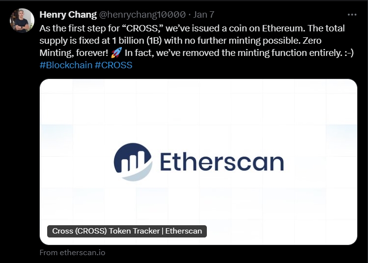 관련해 지난 7일 장 대표는 자신의 SNS 통해 이더리움 기반 암호화폐 ‘크로스’를 발행한혔다. 발행량은 총 10억개로 향후 추가 민팅(발행)은 없으며 관련 기능을 완전히 제거 했다고 예고했다.