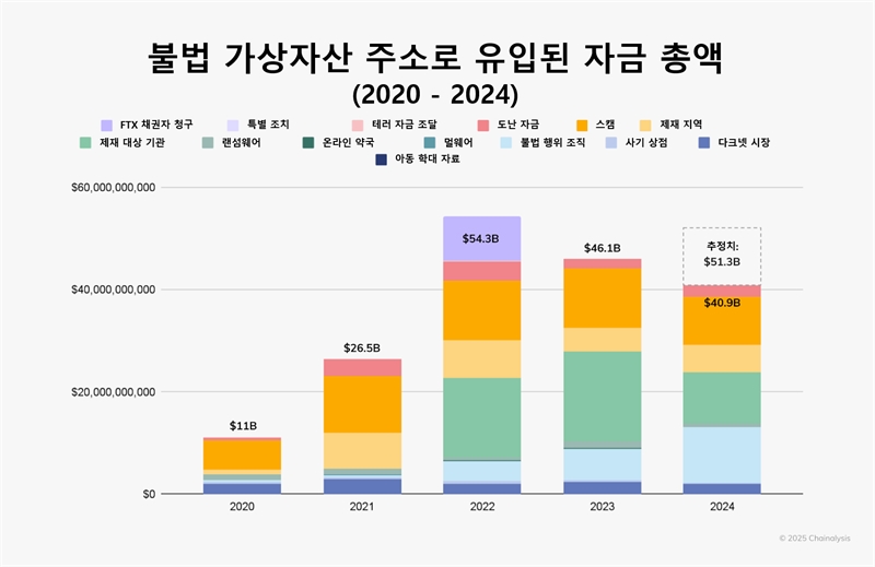 보고서에 따르면 작년 한 해 불법 주소로 유입된 금액은 409억달러(약 54조원)에 달했다. 향후 추가로 파악되는 범죄에 따라 510억달러(약 67조원)까지 증가할 것으로 예상된다. 추가 범죄가 파악된다면 2024년은 가상자산 범죄 역사상 2번째로 불법 활동이 많았던 해가 될 전망이다.