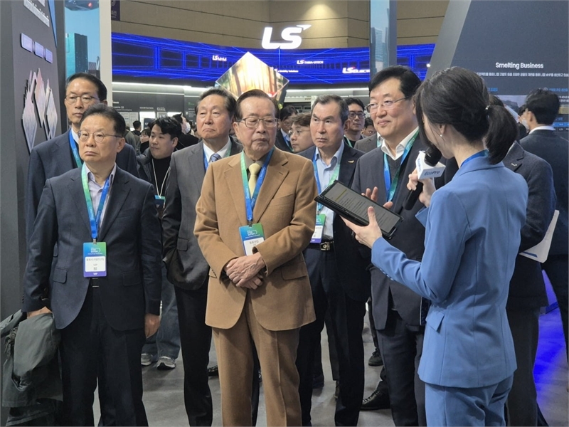 김재철 동원그룹 명예회장이 지난 5일 인터배터리 2025에 참가해 에코프로 부스를 방문하면서 동원그룹의 2차전지 사업을 직접 눈으로 확인했다.(자료=에코프로)
