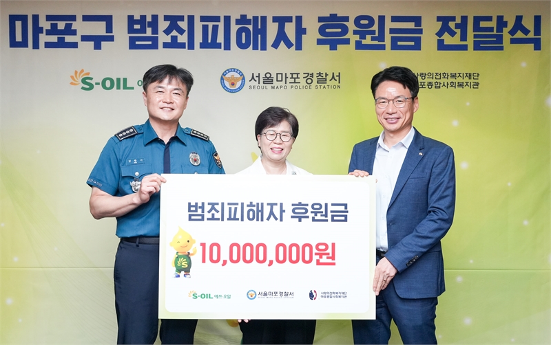 에쓰오일은 24일 서울 마포구 본사에서 마포구 범죄피해자 후원금 전달식을 갖고 사랑의전화 마포종합사회복지관에 후원금을 전달했다.