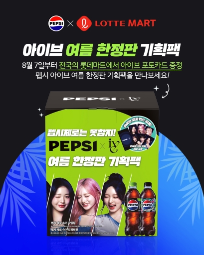 롯데마트·슈퍼는 7일 펩시 제로 x 아이브 포토카드 패키지를 출시한다고 이 날 밝혔다. 여름 한정으로 선보이는 시즌 기획팩으로 ▲펩시 제로 라임(500ml*3입) ▲펩시 제로 모히토(500ml*3입) ▲아이브 포토카드(랜덤 2매)로 구성해 프로모션가 7480원에 판매한다.