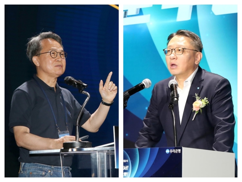 진옥동 신한금융지주 회장(왼쪽)과 정진완 우리은행장 (사진=각사)