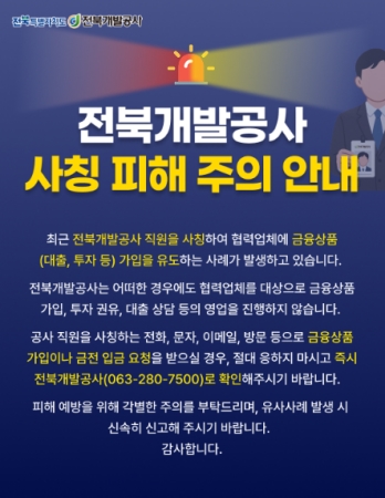 [한국정경신문(전주)=최창윤 기자] 전북개발공사(사장 김대근)는 최근 타 기관에서 임직원을 사칭하여 계약 업체에 금융상품 가입을 유도하는 사례가 잇따라 발생함에 따라 유사 피해 예방 활동을 강화하고 있다고 25일 밝혔다.