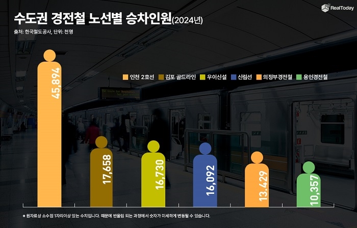 26일 한국철도공사가 발표한 ‘2024년 한국철도통계’에 따르면 수도권 경전철 중 승차 인원이 가장 많은 노선은 인천 2호선이다. 총 4589만4000명이 이용했다.