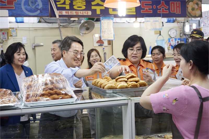 29일 시흥에서 민생경제 현장투어-달달버스(달려간 곳마다 달라집니다)를 진행 중인 김동연 경기도지사가 추석을 앞두고 시흥소방서 다문화 의용소방대와 함께 정왕시장을 방문해 전통시장 화재 안전을 점검했다. 정왕시장 방문한 김동연 지사 (자료=경기도)