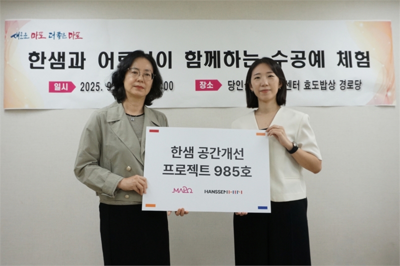 마포구청 어르신동행과 권윤영 과장(좌)과 한샘 기업문화팀 김연의 부장(우)이 기념 사진을 촬영 중이다. (사진=한샘)